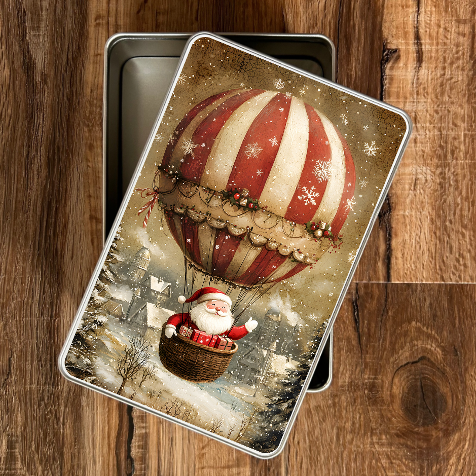 Up, up, and away! Santa Claus takes to the skies in a vintage red-and-cream striped hot air balloon, drifting gracefully above a snowy village below. With a basket full of gifts and a warm wave, he brings a touch of magic from above, delivering joy in the most whimsical way.